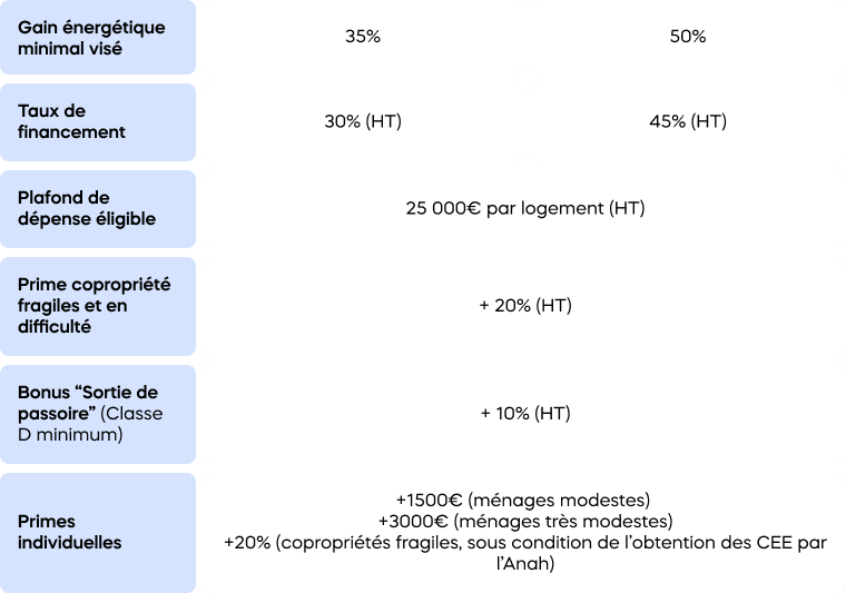 Ce pourcentage maximal inclut un bonus “Sortie de passoire” ainsi que des primes supplémentaires destinées aux copropriétés en difficulté et aux ménages modestes et très modestes.
